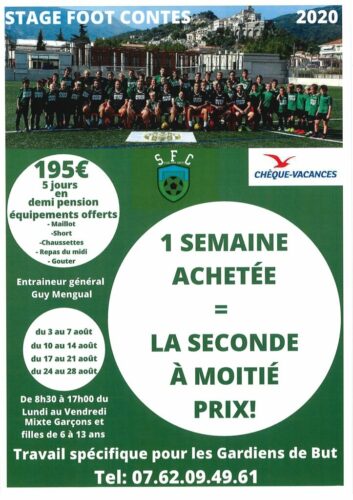 Le club de football de Contes organise pour les enfant de 6 à 13 ans 4 semaines de stage au mois d’août.